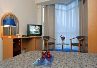В номерах — централизованное кондиционирование, телевизор, телефон, холодильник, санузел с душевой кабиной, фен.